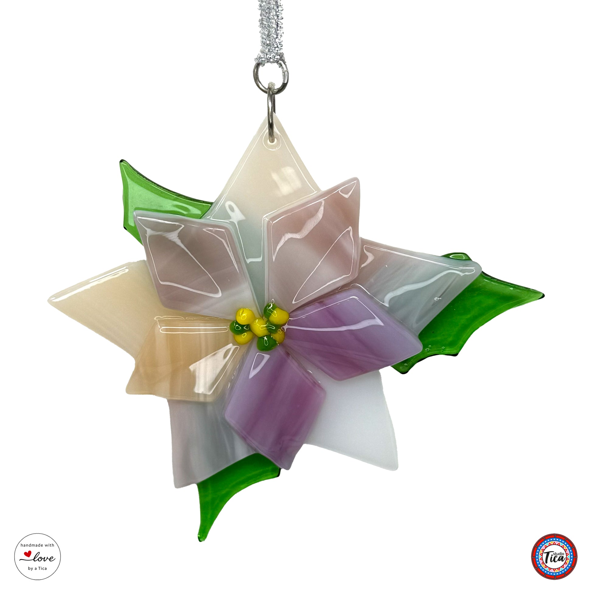 Celebrate the holiday season with this stunning Handmade Glass Christmas Ornament inspired by the vibrant Poinsettia flower. Your choice of a natural leaf or double-sided designs, each ornament features specially cut glass that beautifully resemble the real plant, bringing a touch of nature's elegance into your home decor. The brilliant hues of the glass petals are complemented by bright green leaves and delicate accents in the center, creating a festive and eye-catching piece.