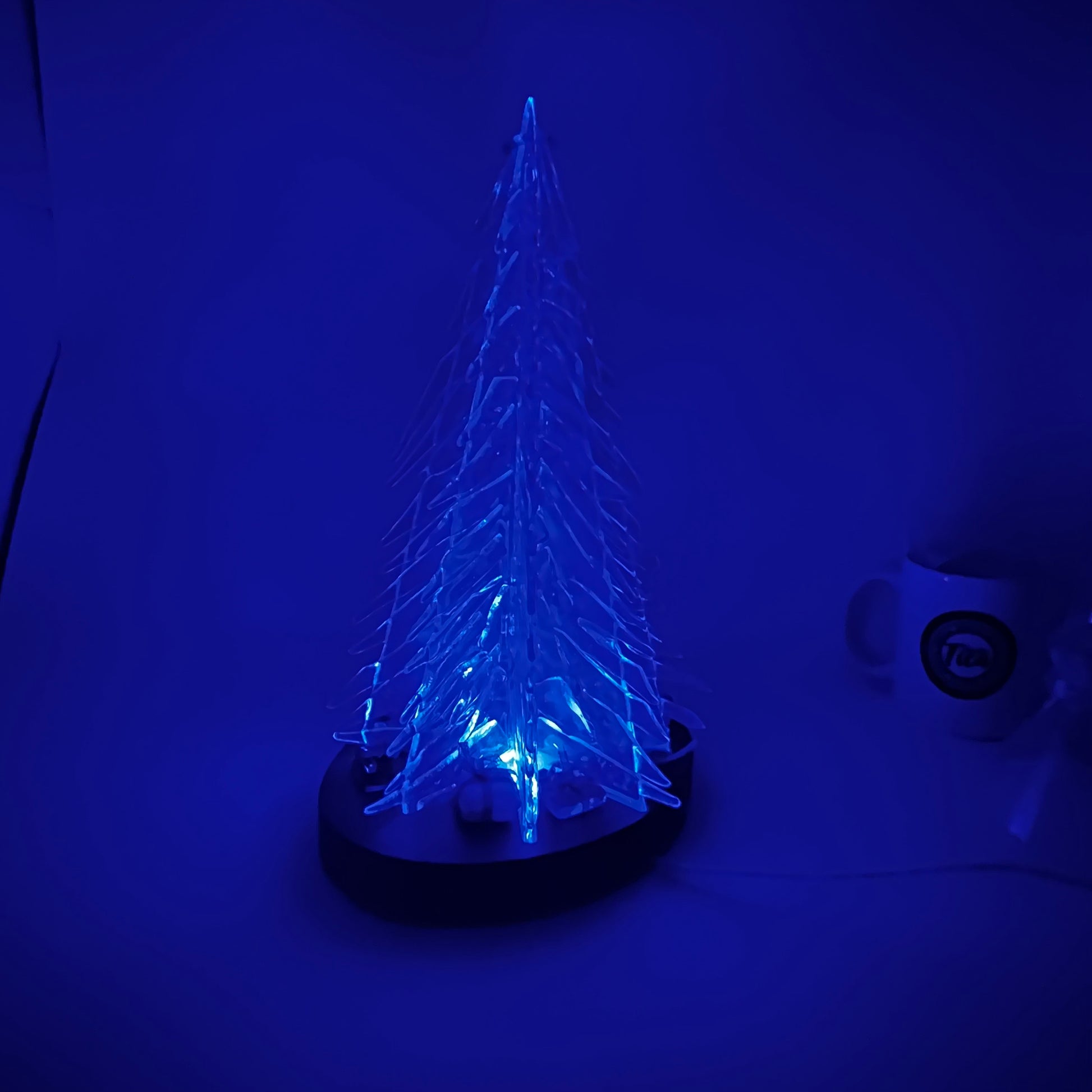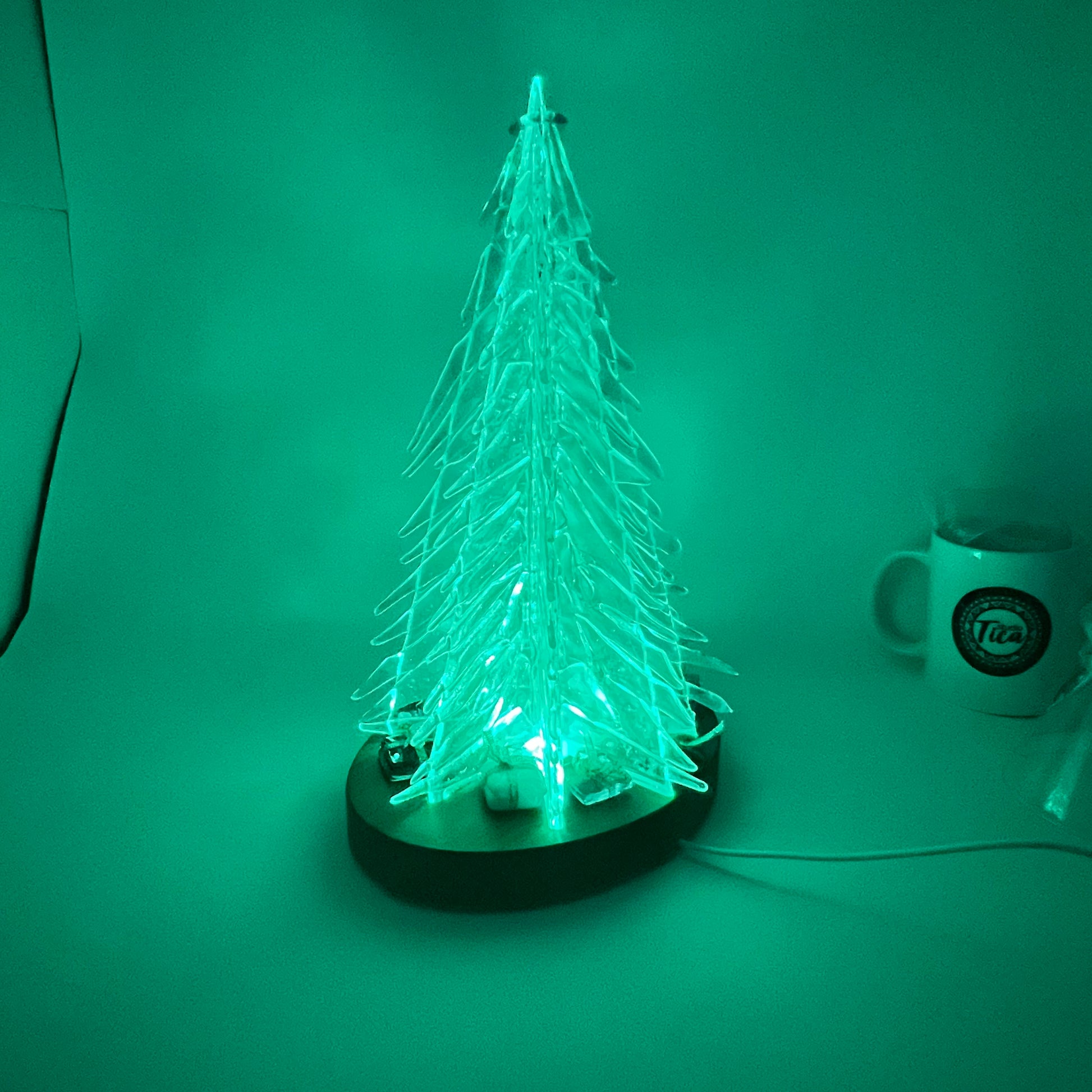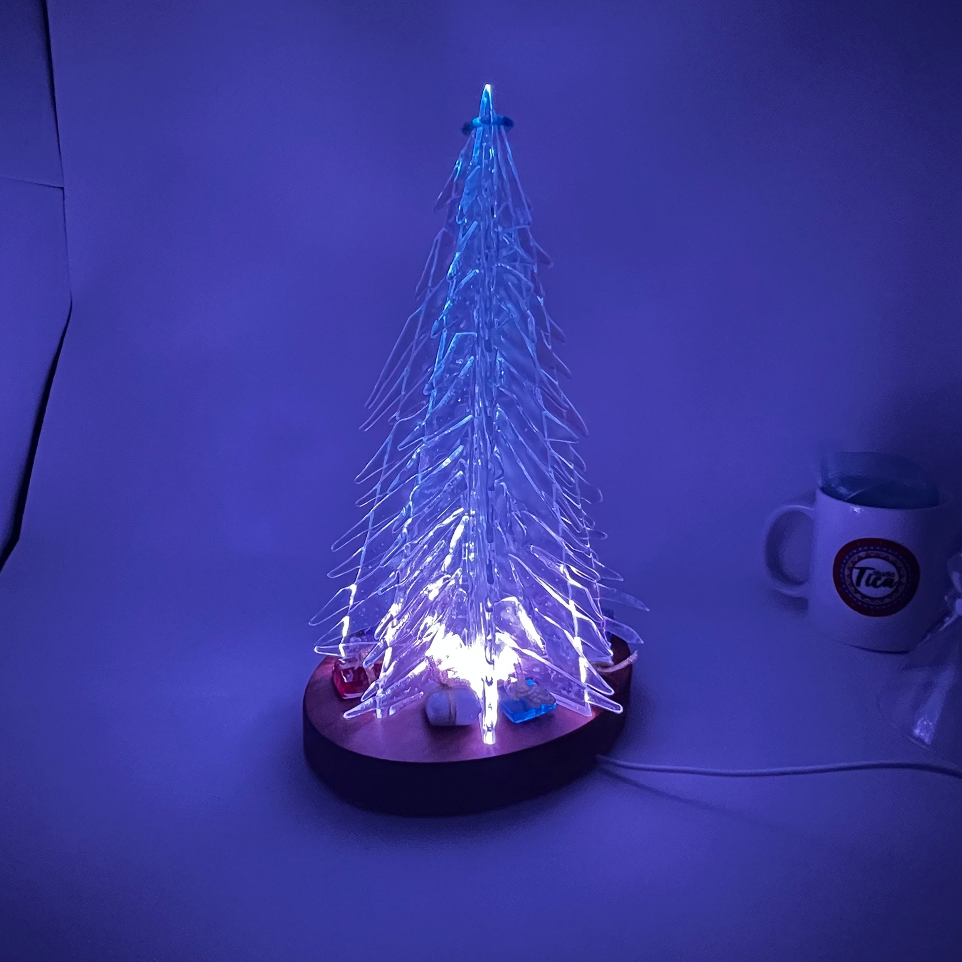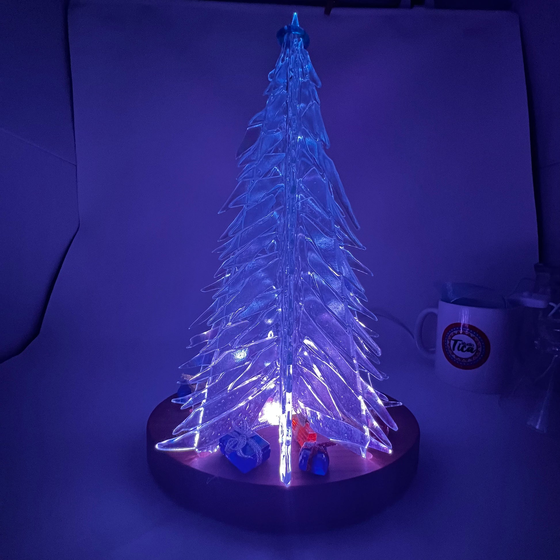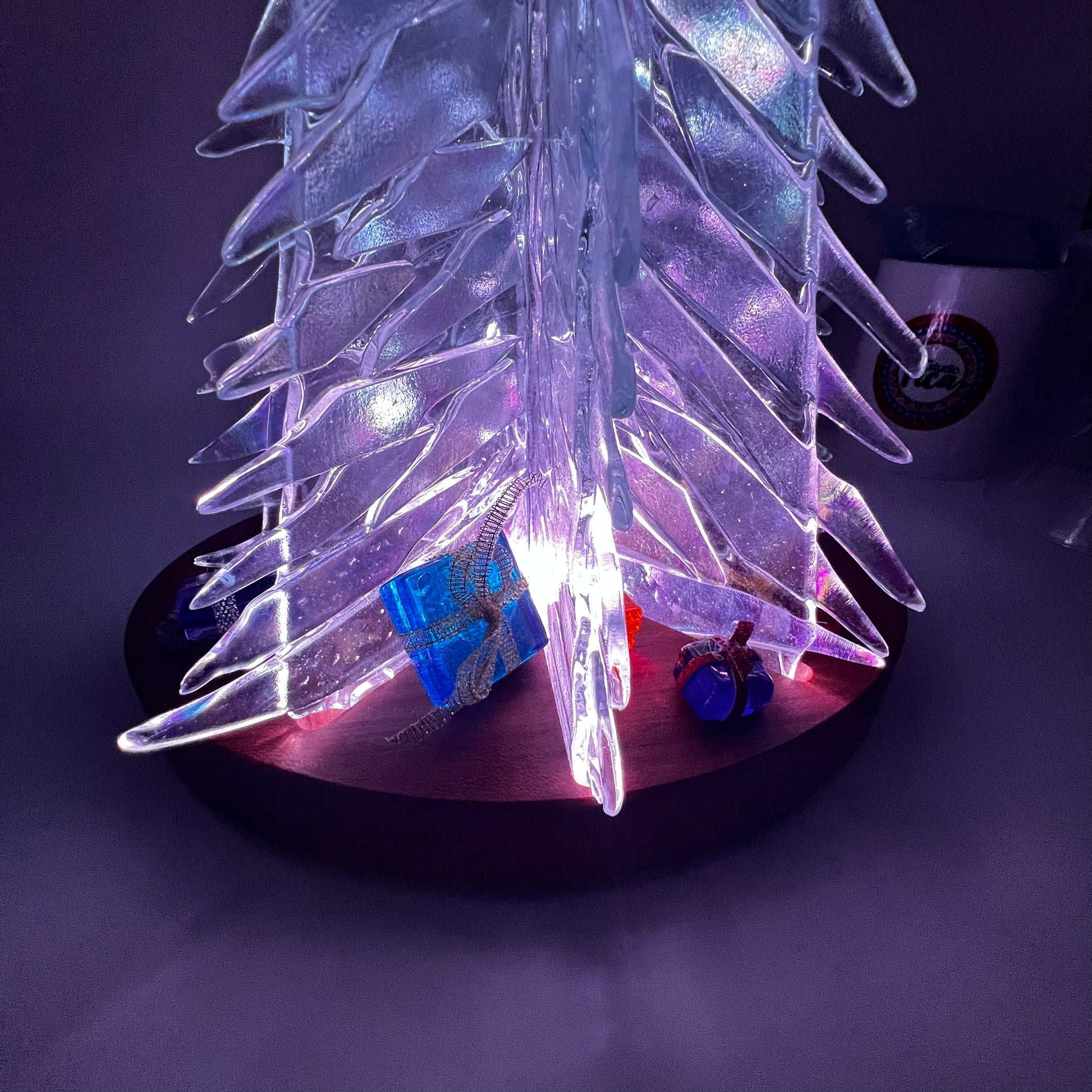 - Description: The Christmas Tree centerpiece is made from 8 stand-alone but intertwined pieces of Frosted Fire ®glass. Included is a custom-made natural Cherry wood with integrated LED light and six small, assorted glass “gifts” and “packages”