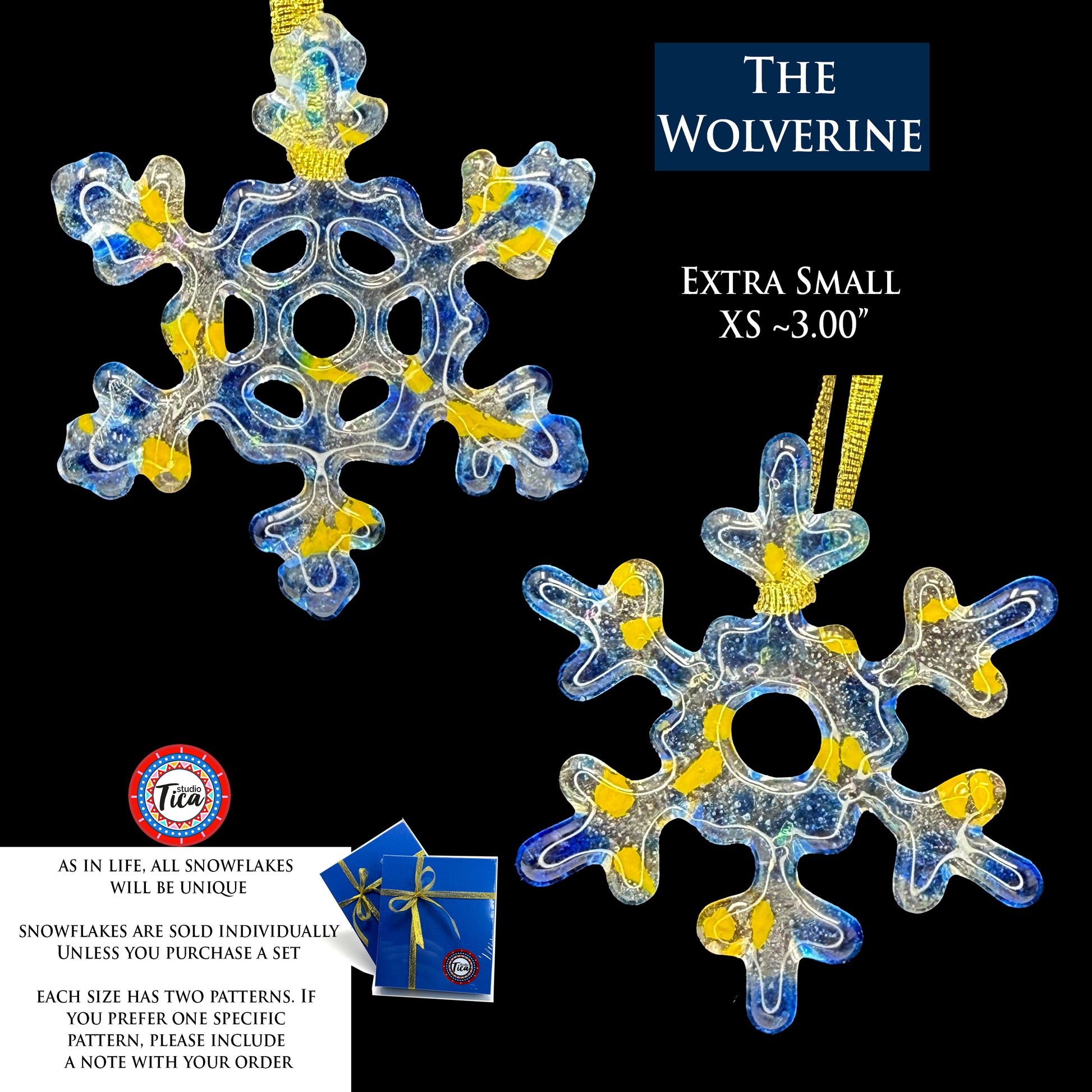 Inspiration: Celebrate the strength, compassion, and enduring spirit of The Wolverine - a handcrafted glass snowflake ornament custom-designed for Lightways.org, supporting hospice and serious illness care. This piece blends artistry and purpose, featuring a radiant combination of blue and yellow / gold colors that symbolize hope, resilience, and pride.