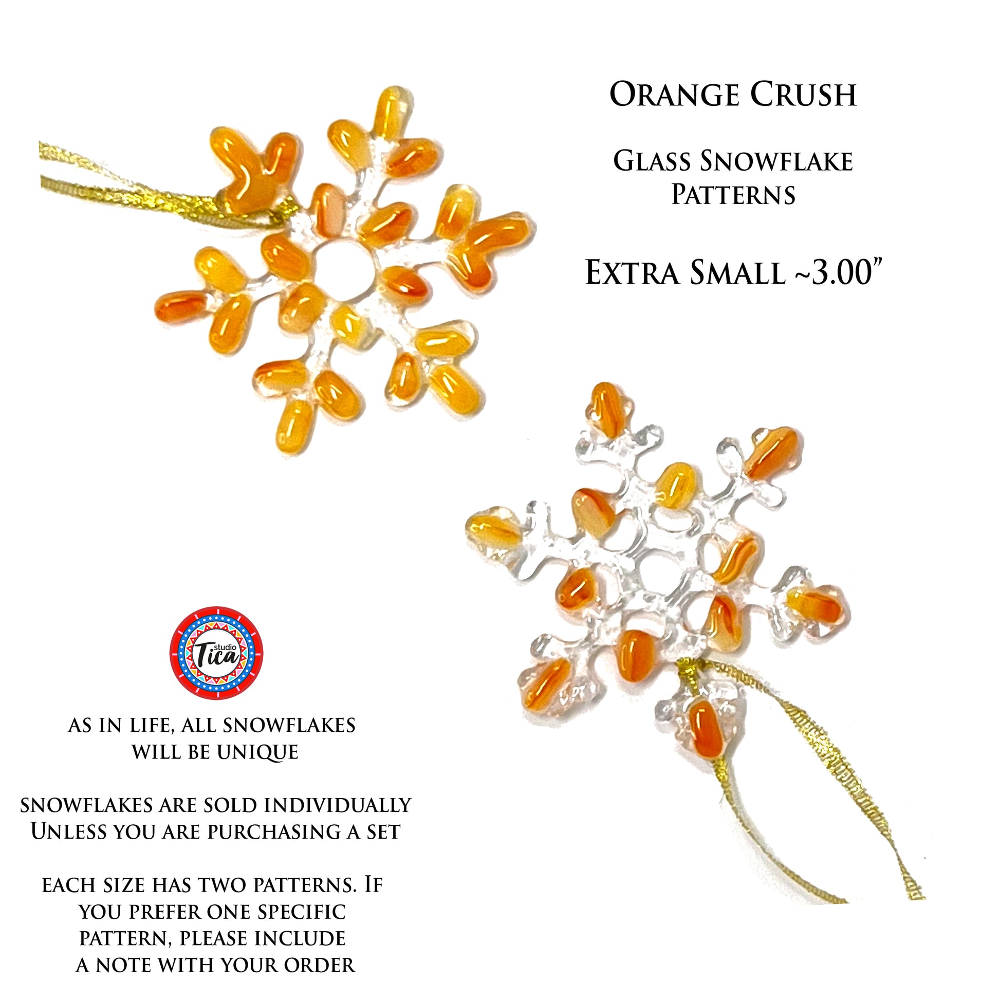 Pattern: This glass Snowflake is made with the same glass as my extremely popular Orange Crush swizzle sticks and combined with crystal-clear glass, which together create a unique and magnificently sparkling holiday ornament. An ornament which will make your home, windows, or Christmas tree dazzle and last a lifetime.